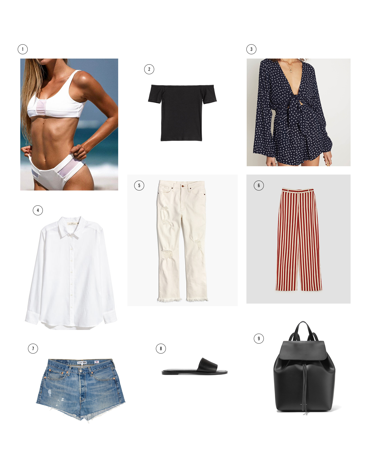 1. Aila Blue Swim Suit, similar here; 2. Black OTS Top; 3. Printed Playsuit; 4. Oversized White Button Down; 5. Ecru Kick Flare Denim, similar here; 6. Wide Leg Striped Pants; 7. Levi’s Cut Offs; 8. Black Leather Slides, similar here; 9. Black Leather Backpack